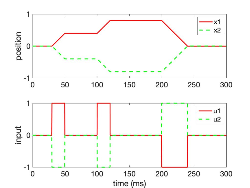 The same neural integrator is involved in saccadic eye movements. In both cases, neural activity that is proportional to “velocity” of the eye is converted into neural activity that is proportional to “position” of the eye.